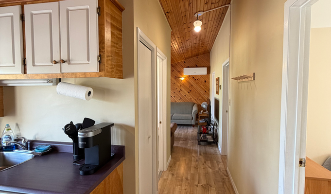 This cottage is fully equipped and offers pine walls and pine cathedral ceilings. It has A/C, digital-cable, and high-speed Wi-Fi. Each cottage is pet, smoke, and allergen free with laminate flooring. A double-sized sofa bed is in the living room; four-piece full bathroom and a two-piece half bath; full-size fridge; full-size stove; microwave; Keurig coffee maker; pots; pans; dishes; ceiling fan in each bedroom; extra pillows and blankets; and a gas barbecue and picnic table on each deck.